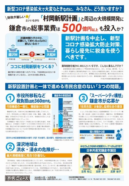 新型コロナ感染拡大で大変なときなのに、みなさんどう思いますか?財政が厳しいといいながら「村岡新駅計画」と周辺の大規模開発に鎌倉市の総事業費は500億円以上も投入か?新駅設置計画と一体で進める市民合意のない「3つの問題」。1,市役所移転など税負担は約360億円も2,深沢地域は洪水・浸水の危険が・・・3,「スーパーシティ構想」鎌倉市が応募か。住民合意のない村岡新駅は必要なのでしょうか?住民のための駅ではない!大規模開発・大企業支援ありきで推進!新駅建設止めるなら今です。住民の世論と運動で村岡新駅計画を中止させましょう。共産党は県議会でも藤沢、鎌倉市議会でも新駅計画中止を要求。